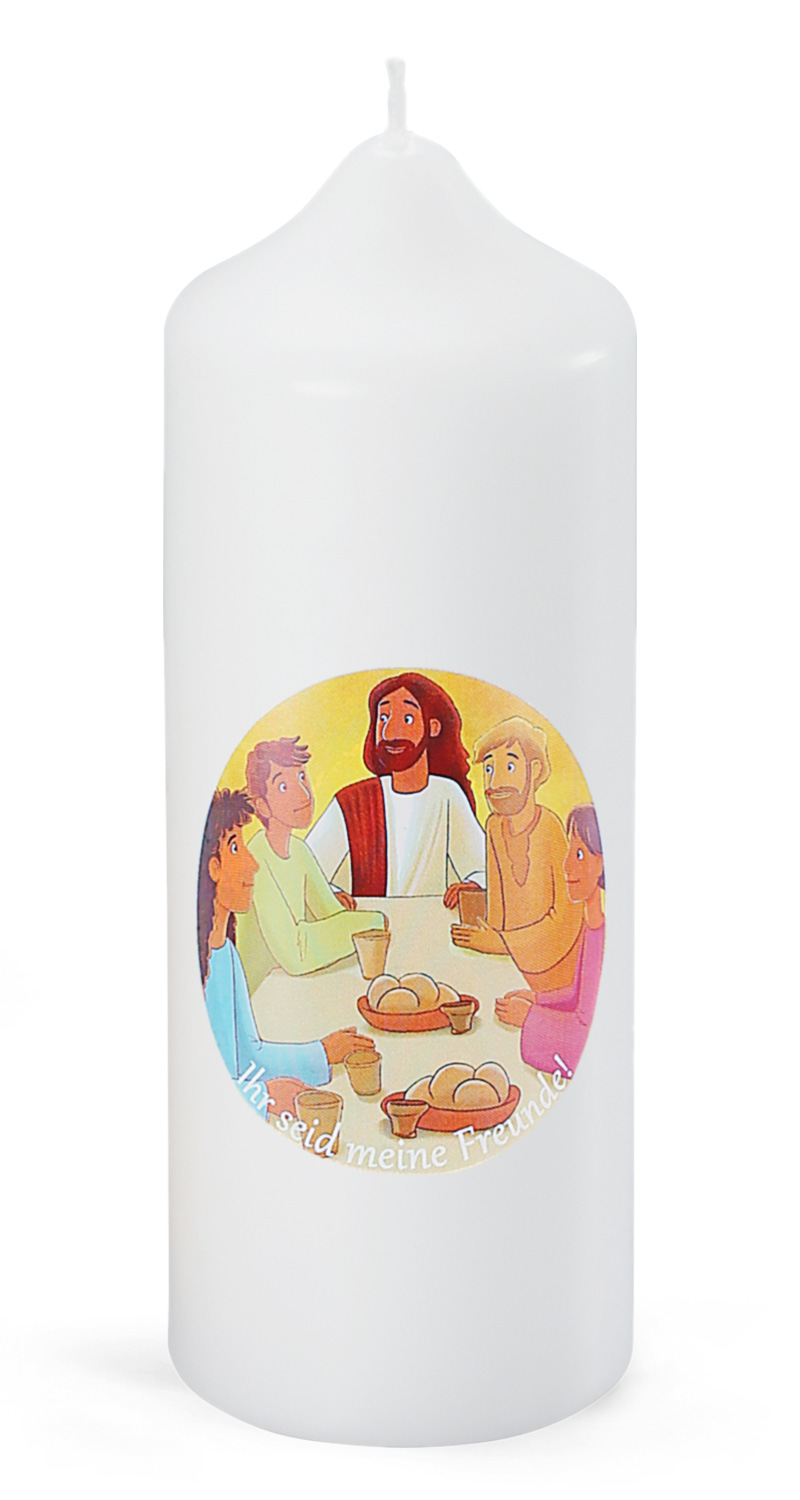 • Patenkerze zum Kommunionthema 2026: "Ihr seid meine Freunde!". Motiv passend zur Kommunionkerze 5949 bzw. zur Kommuniontischkerze 4949.