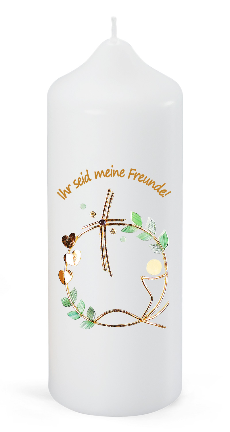 • Patenkerze zum Kommunionthema 2026: Schriftzug Ihr seid meine Freunde! über dem Eukalyptuskranz mit Kelch und Hostie. Motiv passend zur Kommunionkerze 5950 bzw. zur Kommuniontischkerze 4950.