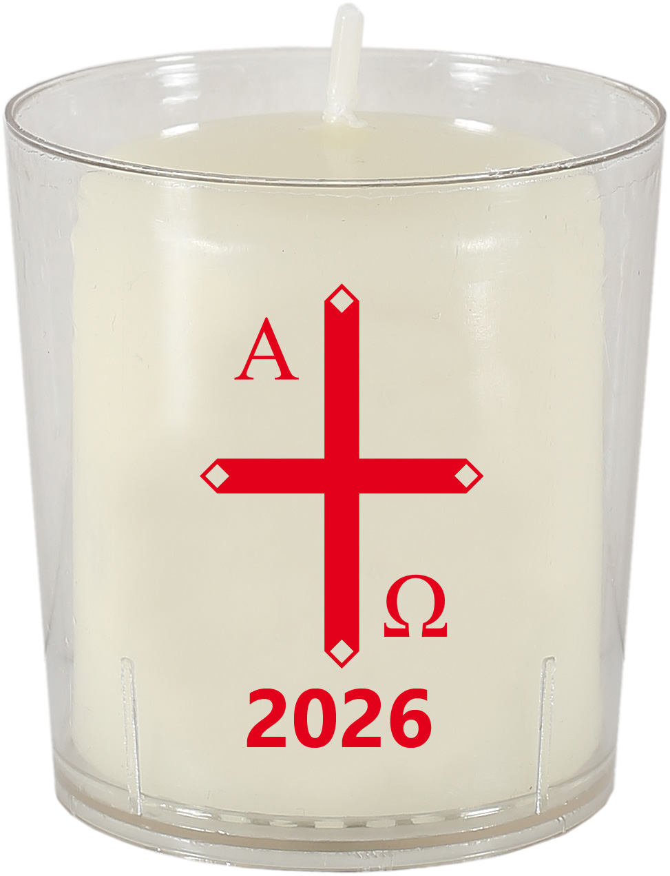 • 50 transparente Kerzenbecher aus Recyclingplastik, passend zur Kerzengröße, mit Motivaufkleber: Kreuz, Alpha, Omega mit Jahreszahl 2026.