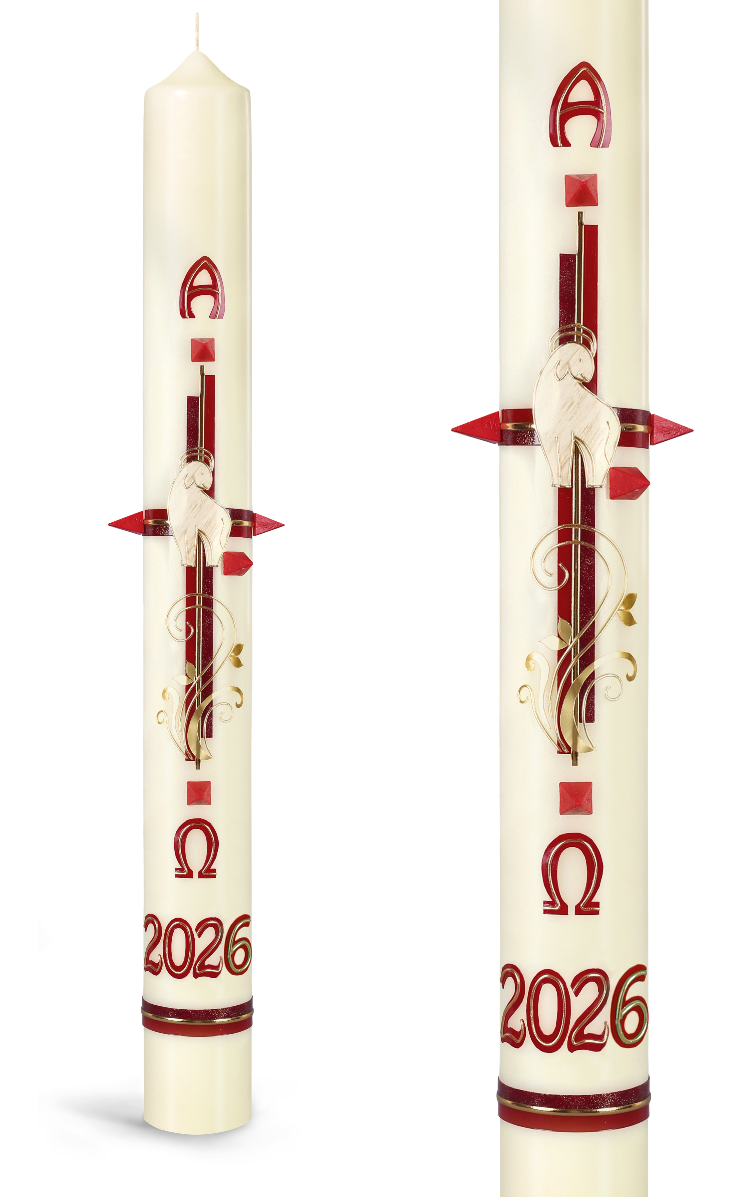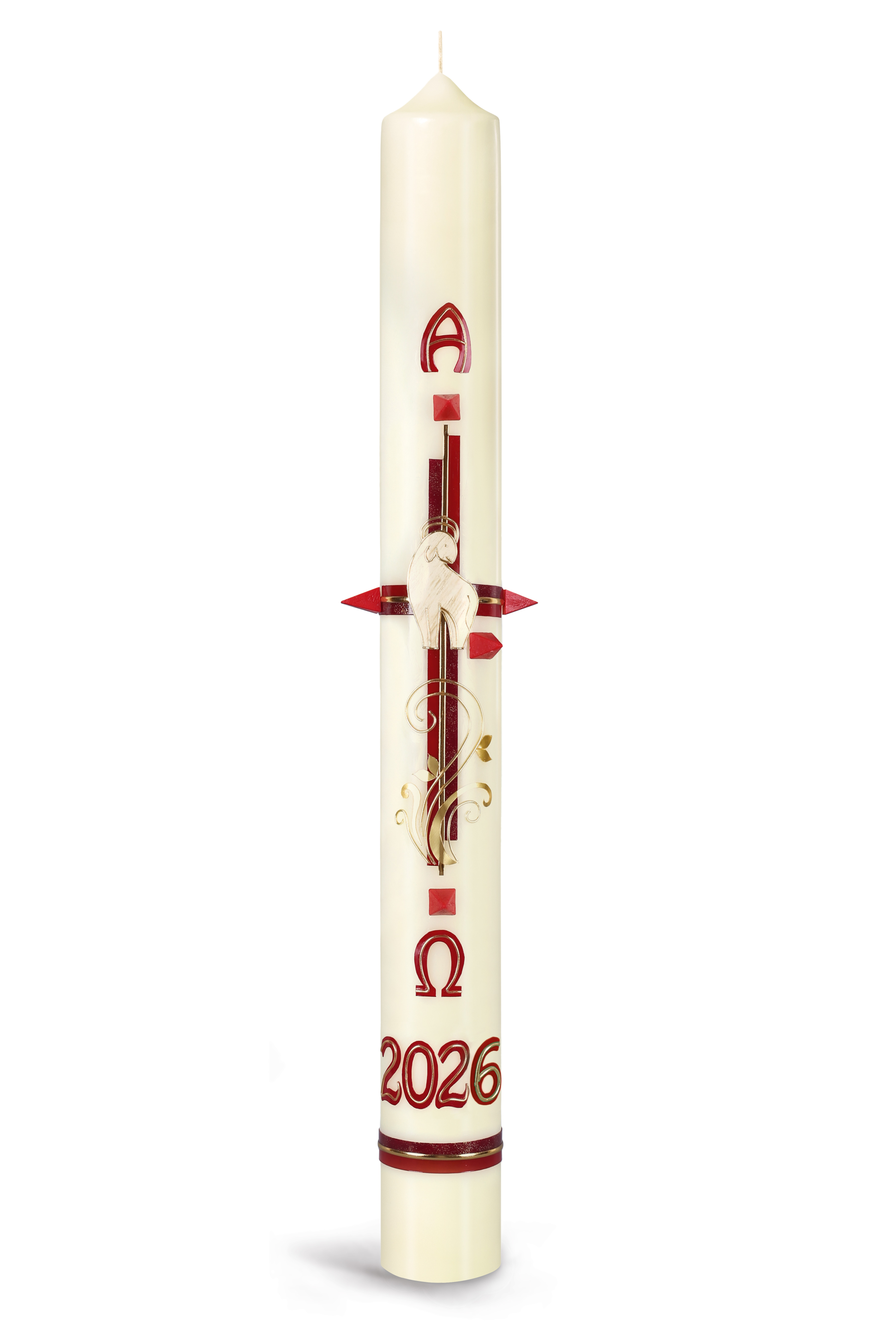 Ostertischkerze, 2026, Kreuz rot, Lamm, Fotodruck, Nr.230155, Größe wählbar
