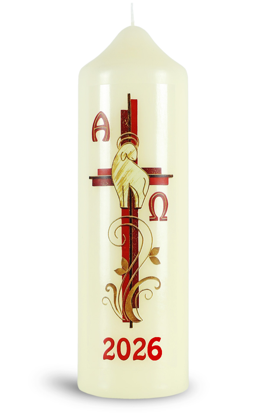 Produktinformationen "Ostertischkerze, 2026, Kreuz rot, Lamm, Fotodruck, Nr.230155, Größe wählbar"