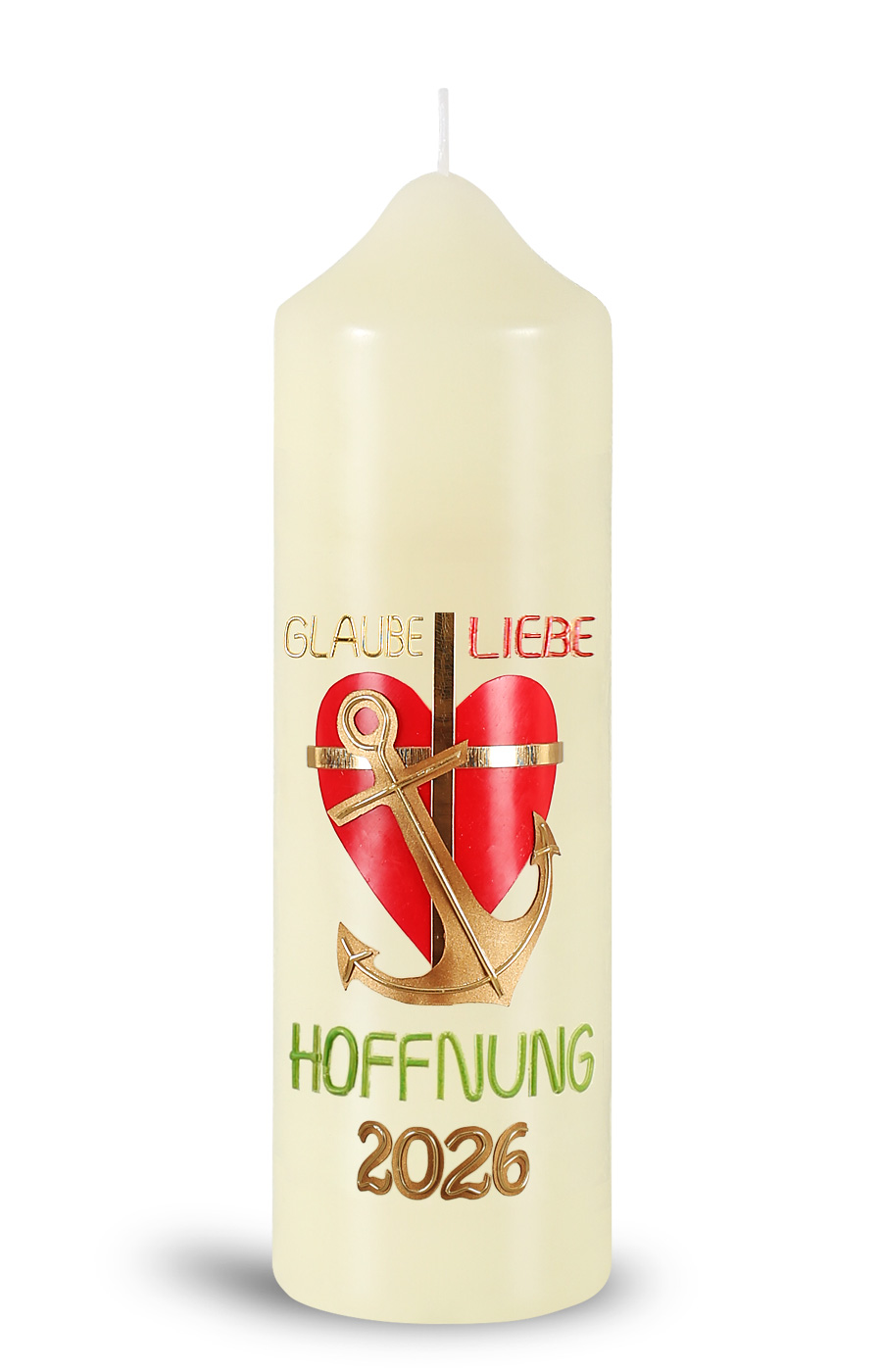 Produktinformationen "Ostertischkerze, 2026, Glaube Liebe Hoffnung, Fotodruck, Nr.260132, Größe wählbar"